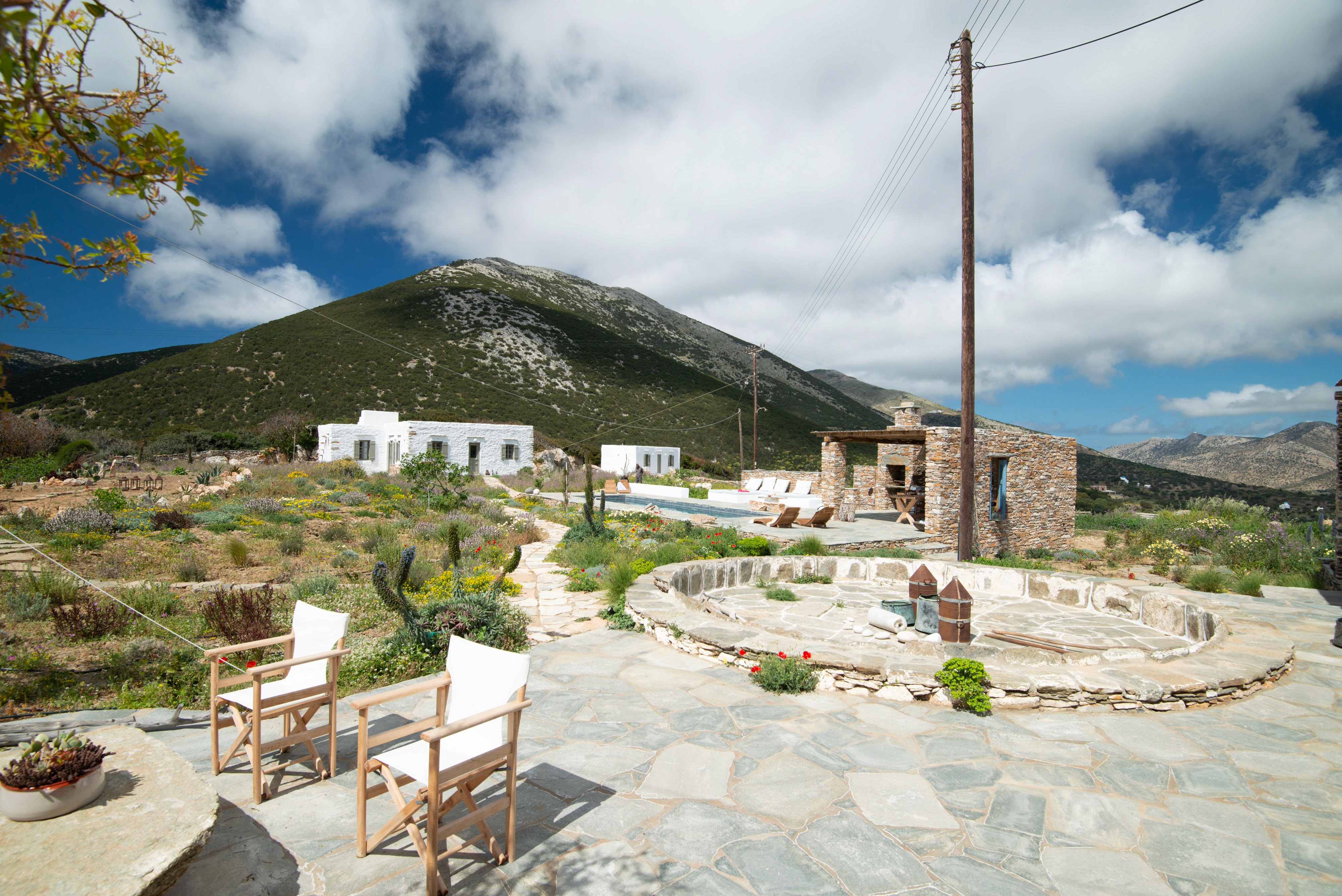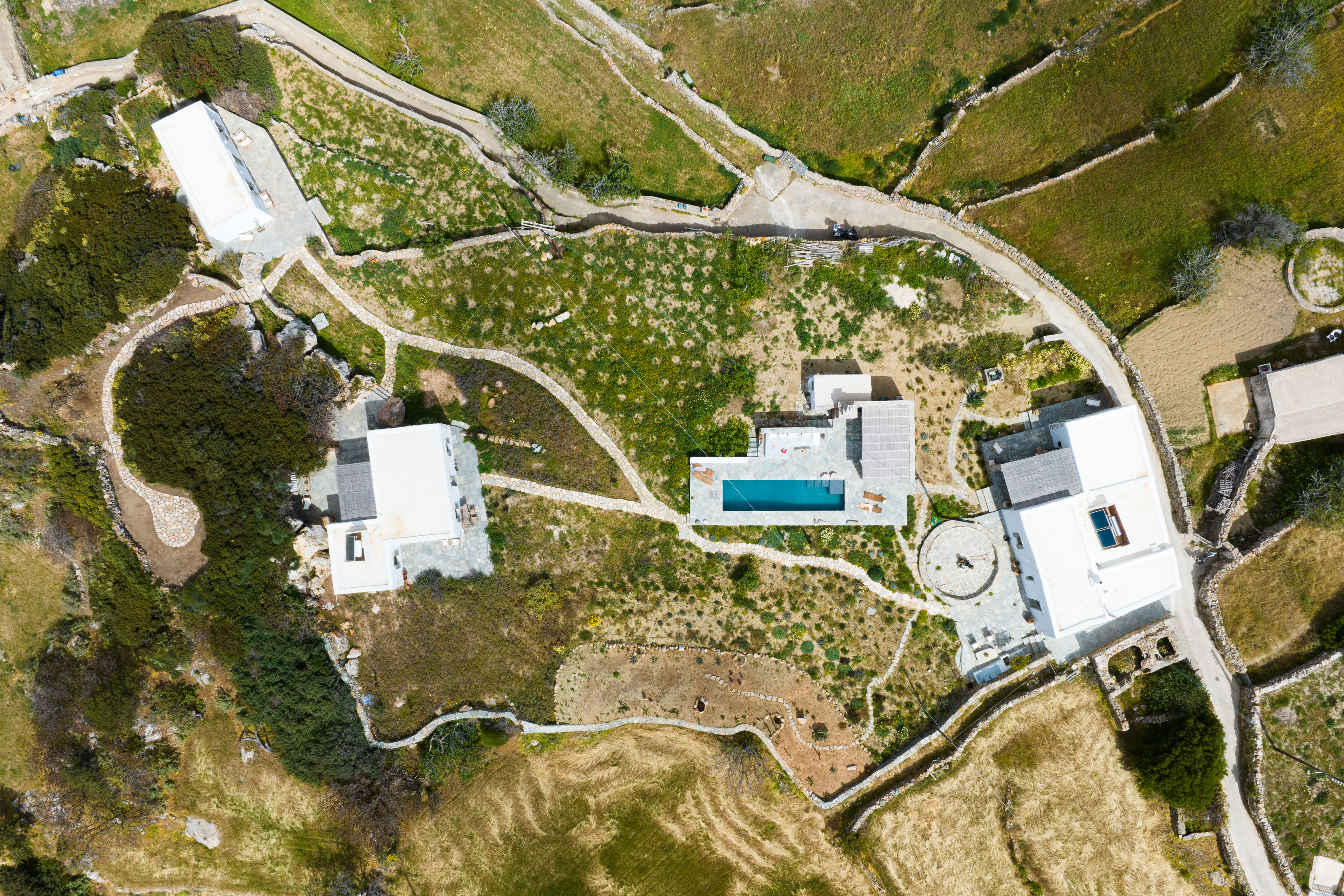 Between the houses, there is a pool of 25 m² (10m x 2.5m) with a lounge area and an outside kitchen with traditional sifnean BBQ (panostria). Between the second and third house there is a path leading onto a small hill on the property, the ideal spot for meditation and yoga.