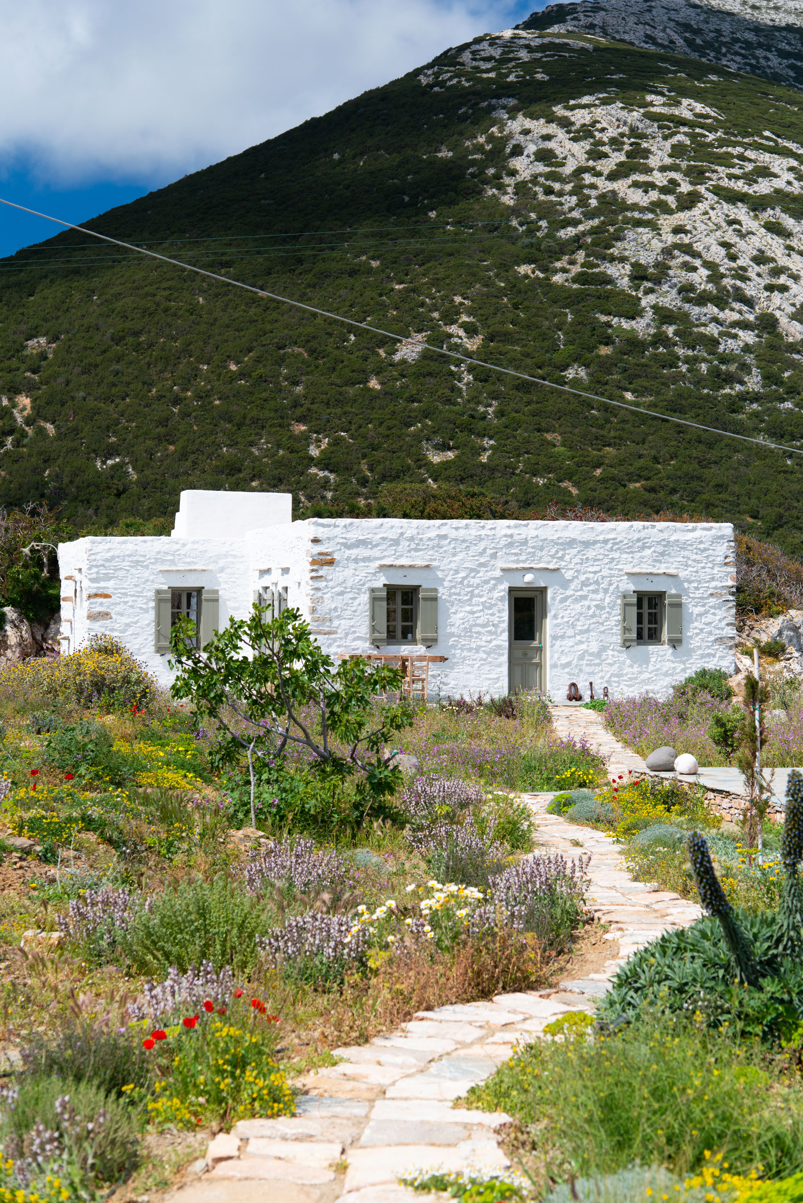 The garden hosts the original vegetation of the hill and in addition planted Mediterranean plants and trees, such as cypress, old and young olive trees, lavender, thyme (thimari), oregano (rigani), figs (pick the soft ones!) and a vineyard.